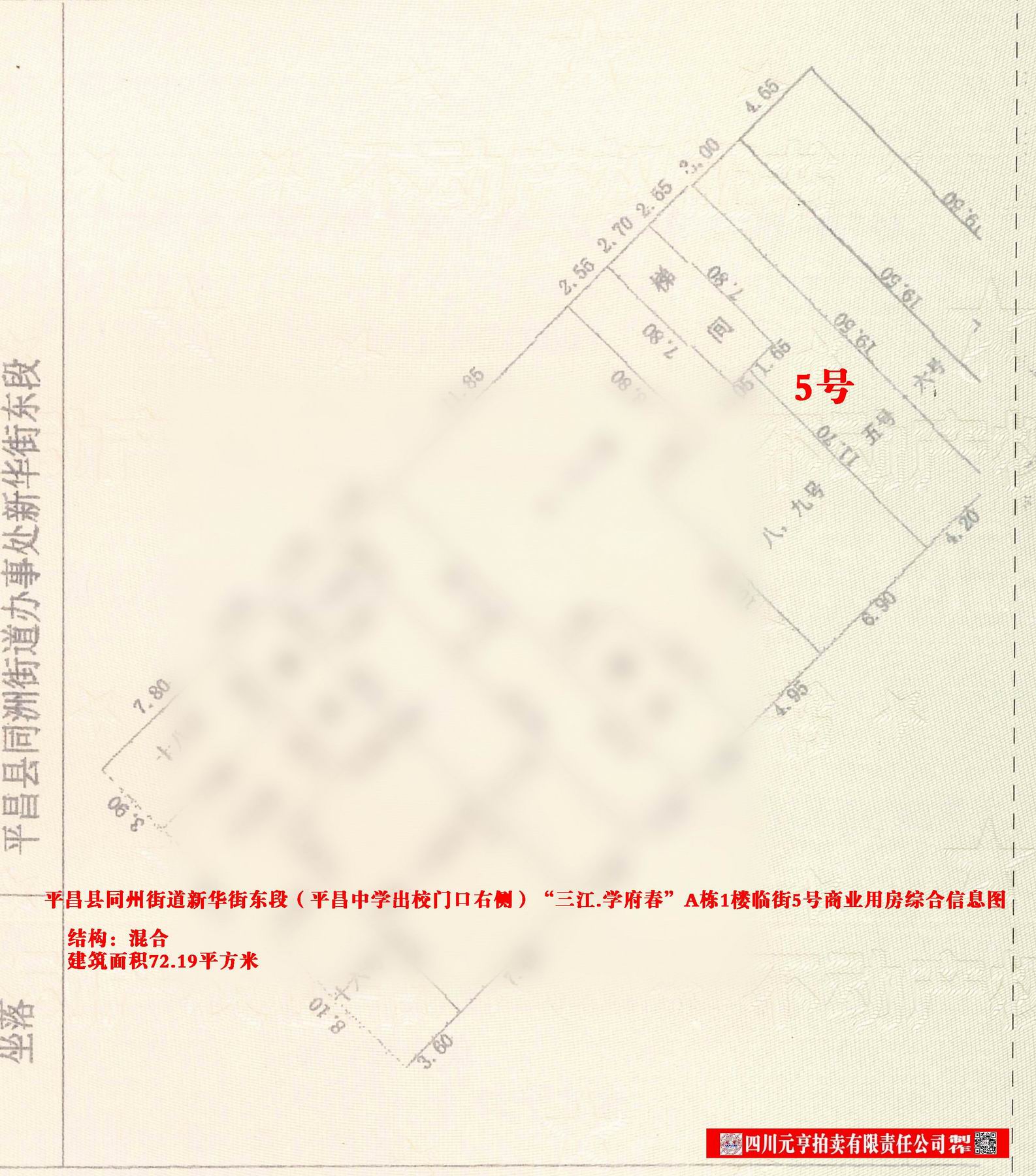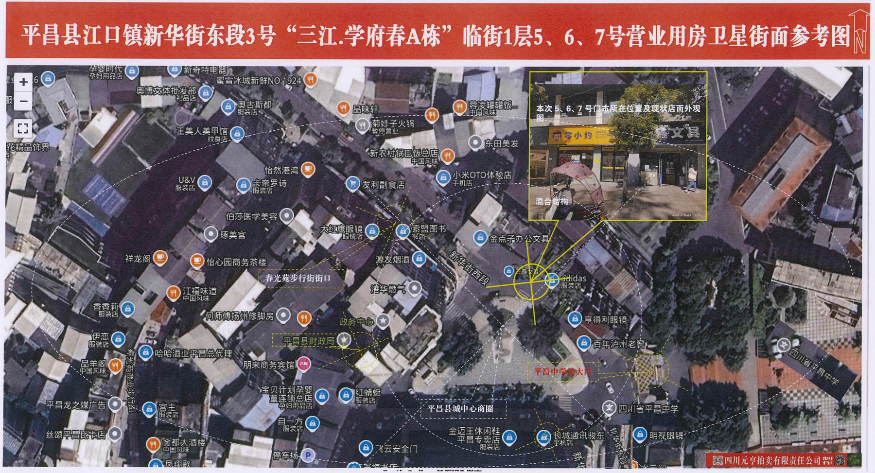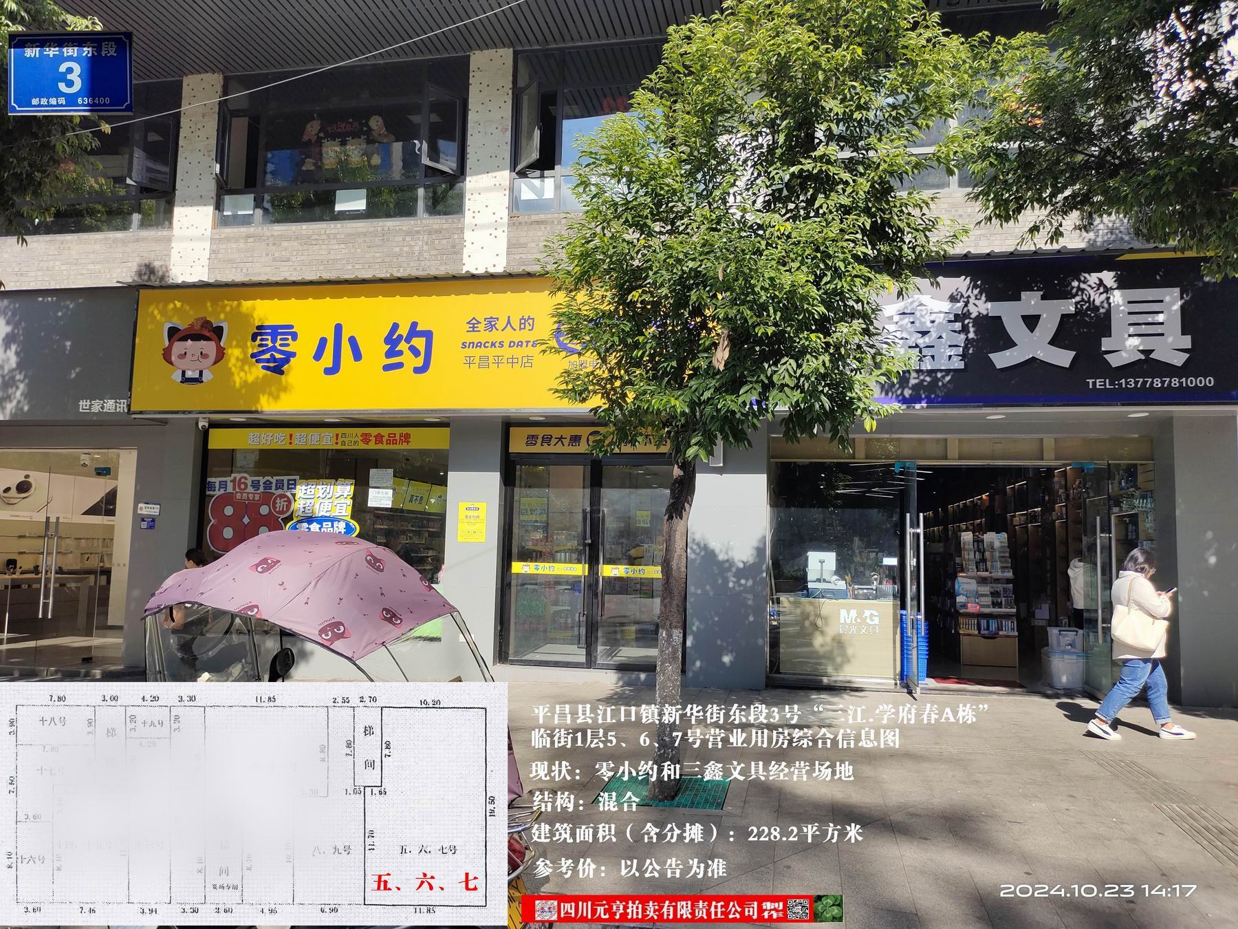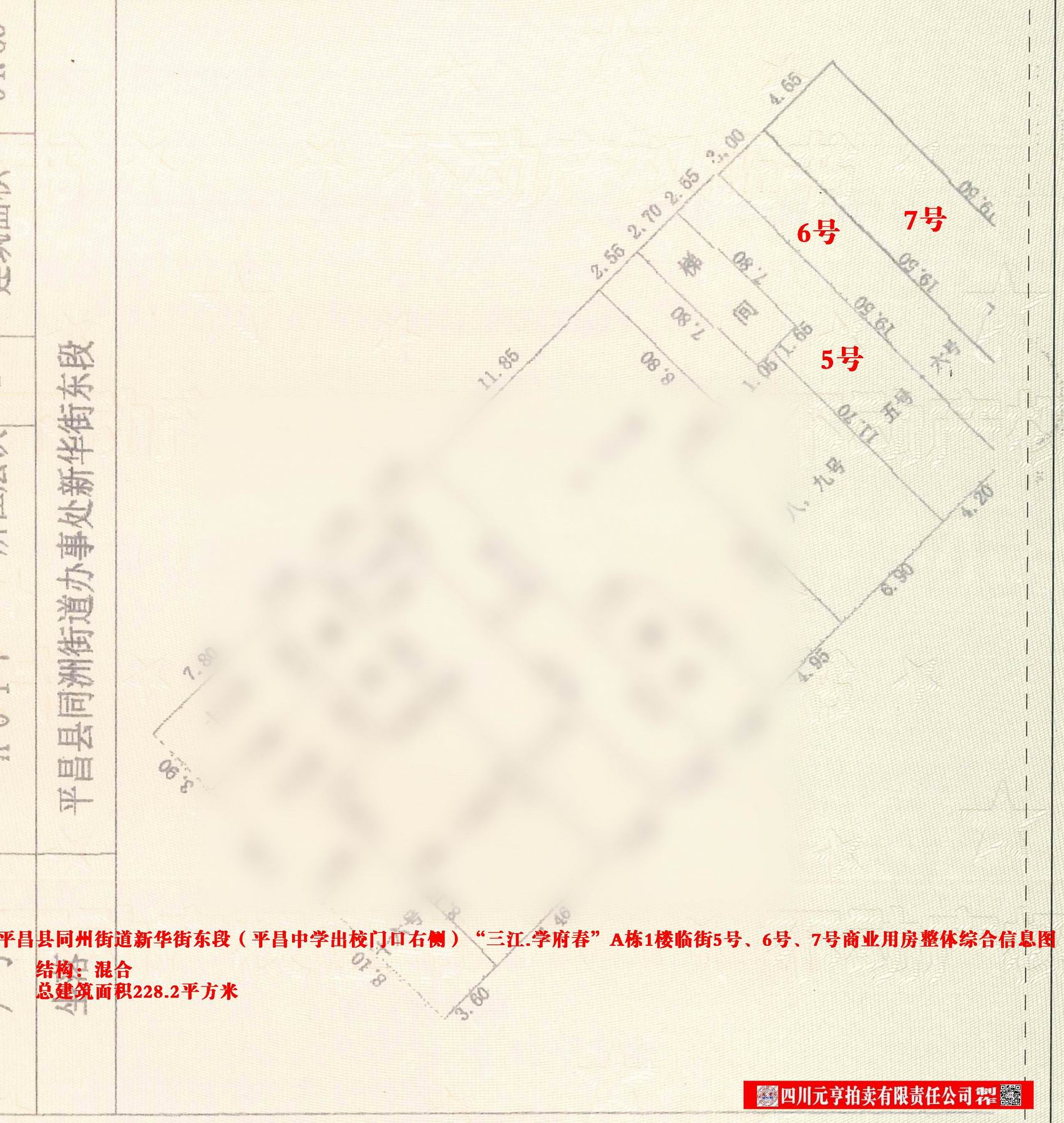 平昌县同州街道新华街东段(平昌中学出校门口右侧)“三江.学府春”A栋1楼临街5号、6号、7号商业用房,混合结构,总建筑面积228.2m2,整体拍卖优先,起拍价447.29万元;整体无人竞买情况下, 5号、6号、7号商业用房分单个拍卖,单个信息如下: