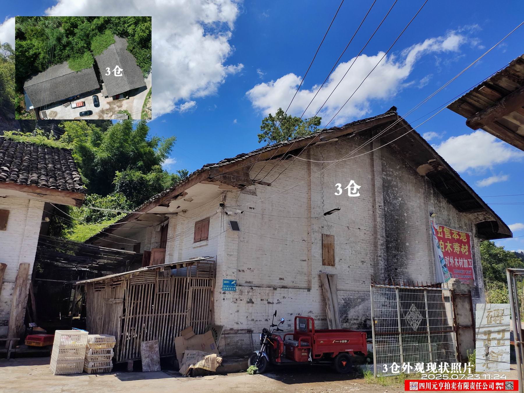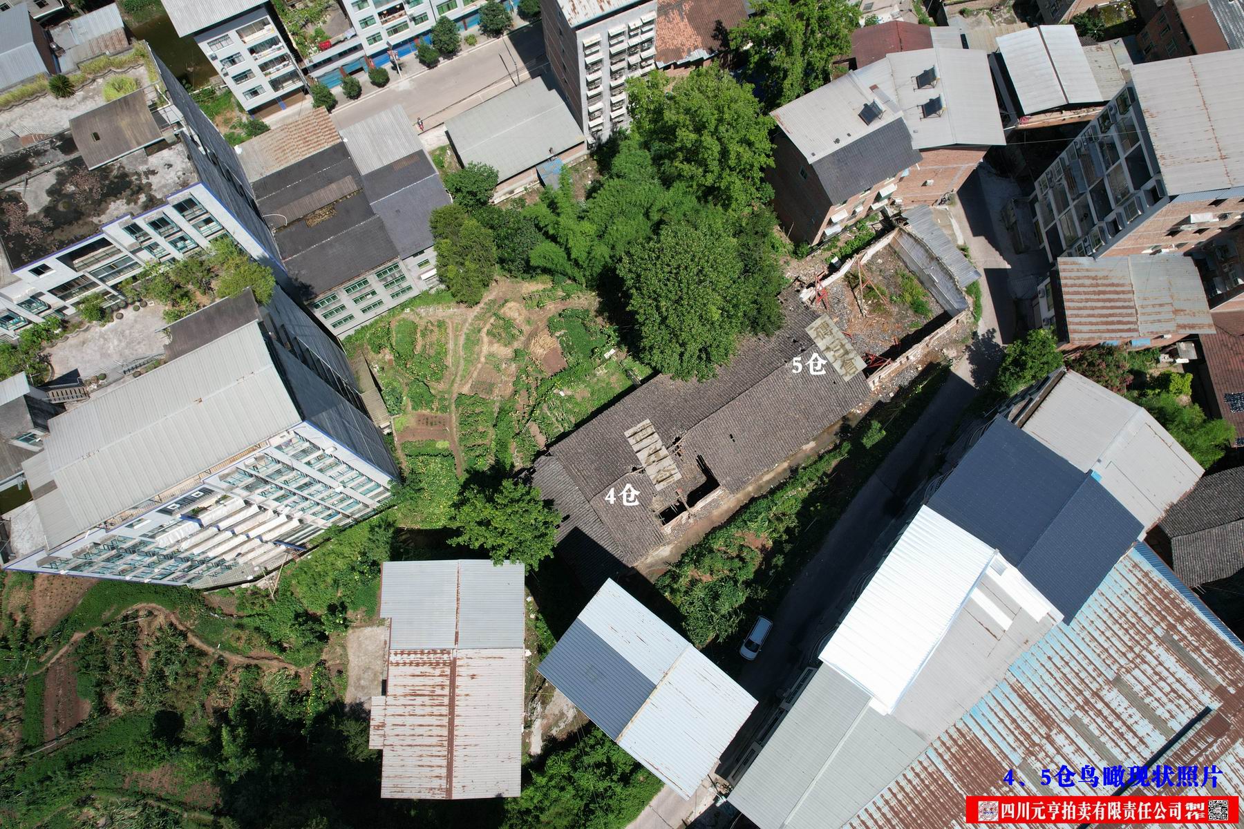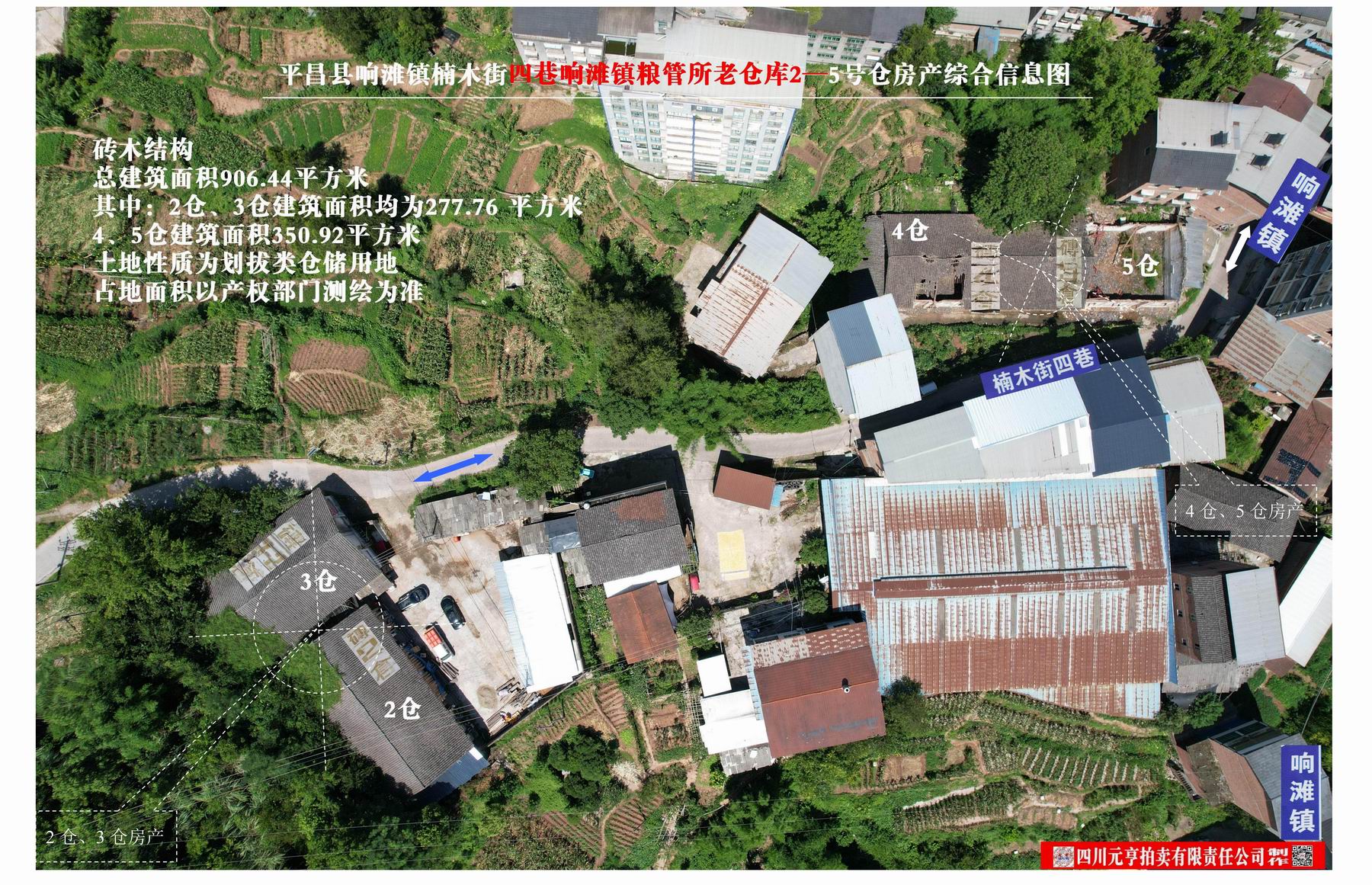 平昌县响滩镇楠木街四巷响滩镇粮管所老仓库2—5号仓房产,砖木结构,总建筑面积906.44m2(其中:2仓、3仓建筑面积均为277.76 m2、4、5仓建筑面积350.92 m2),整体出售,起拍价25.36万元。