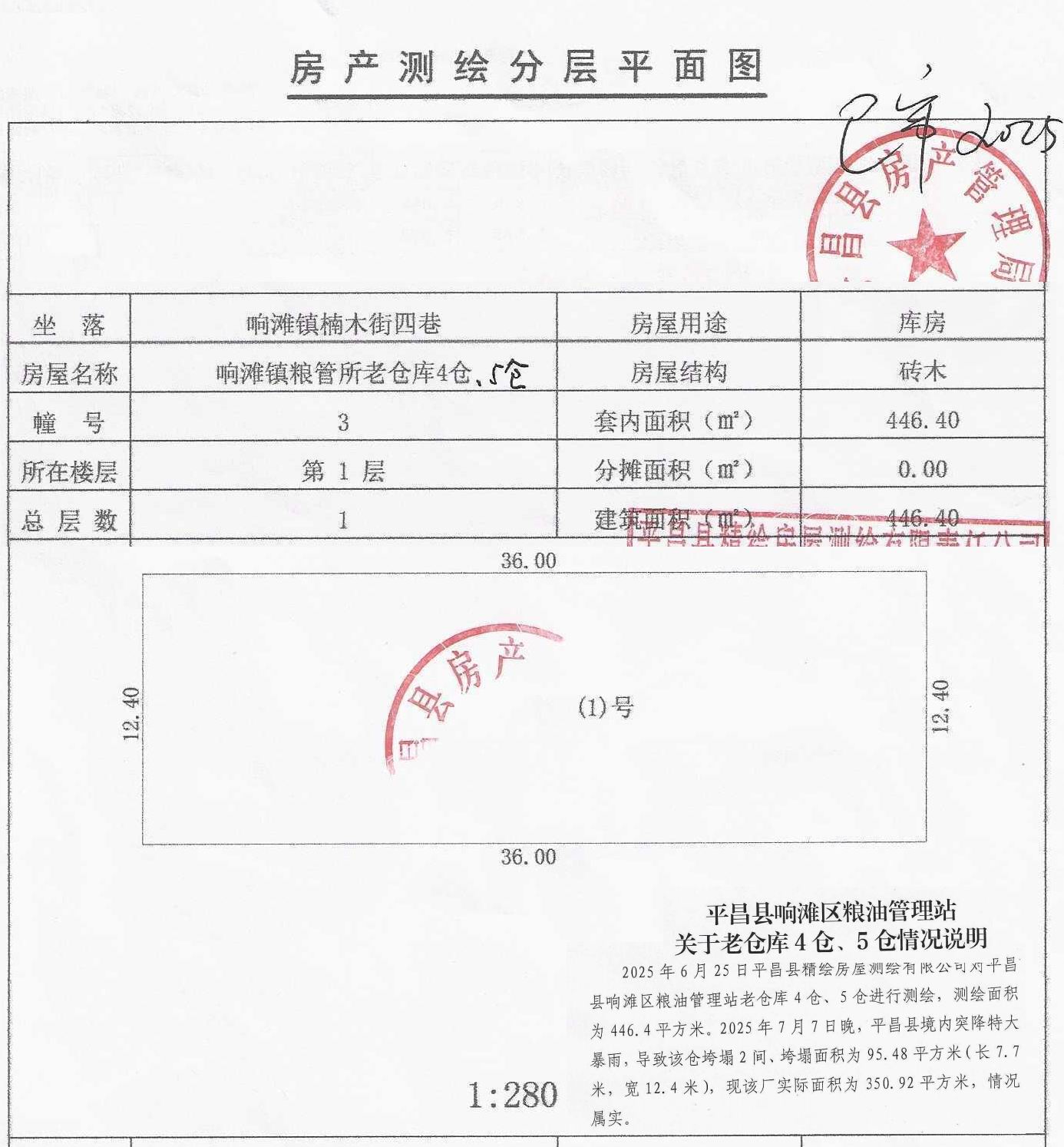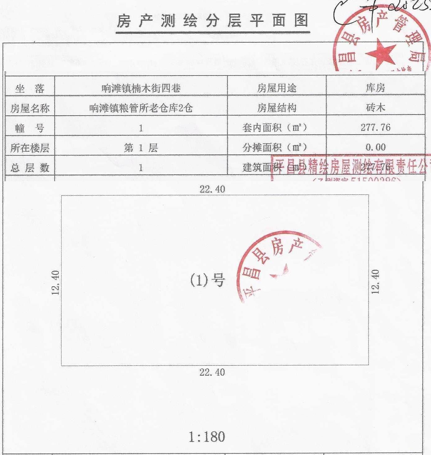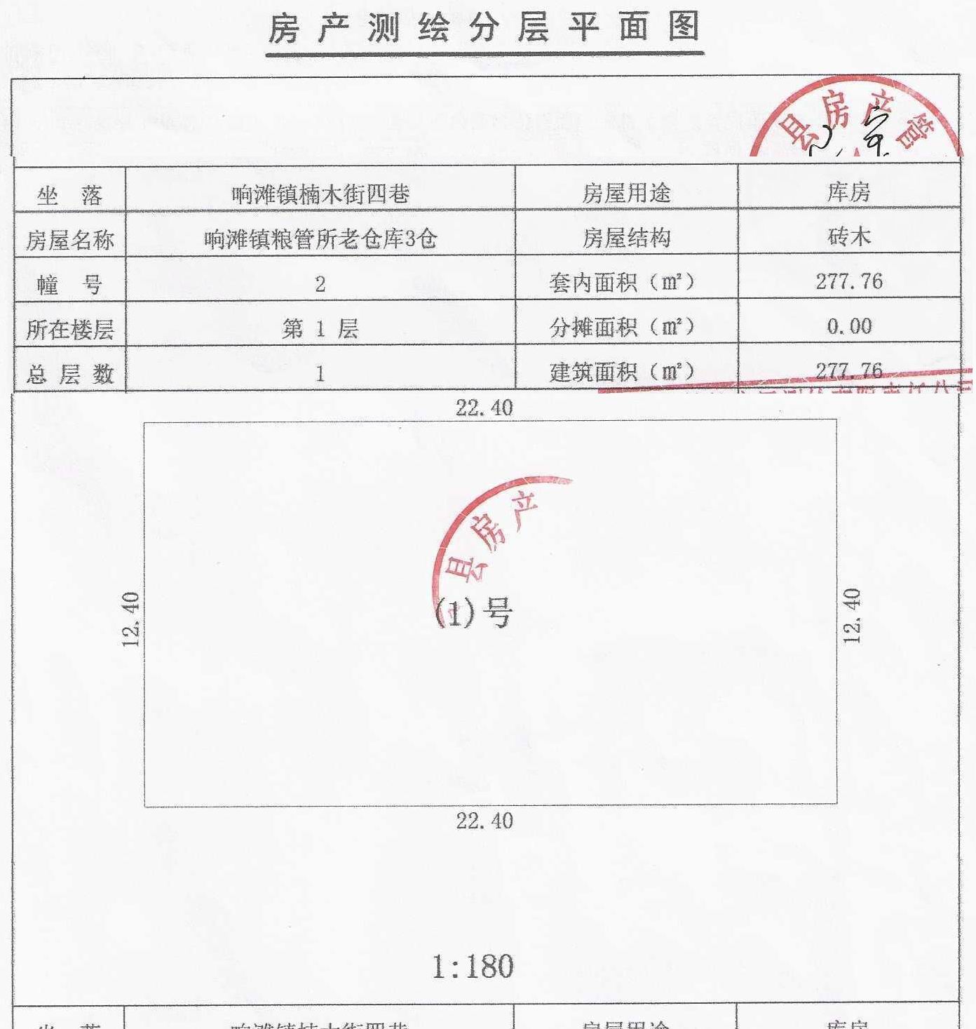 平昌县响滩镇楠木街四巷响滩镇粮管所老仓库2—5号仓房产,砖木结构,总建筑面积906.44m2(其中:2仓、3仓建筑面积均为277.76 m2、4、5仓建筑面积350.92 m2),整体出售,起拍价25.36万元。