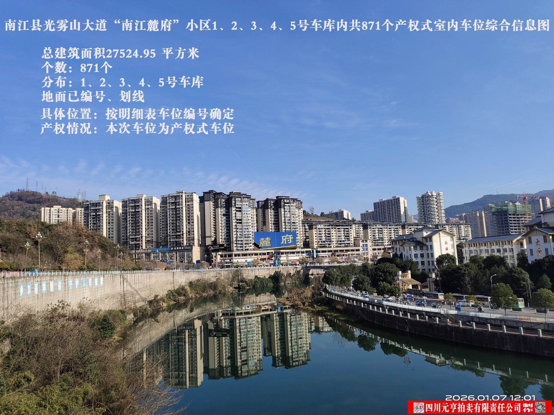 南江县光雾山大道“南江麓府”小区1、2、3、4、5号车库内共871个产权式室内车位,总建筑面积27524.95 m2,整体拍卖,参考价2203.5万元。