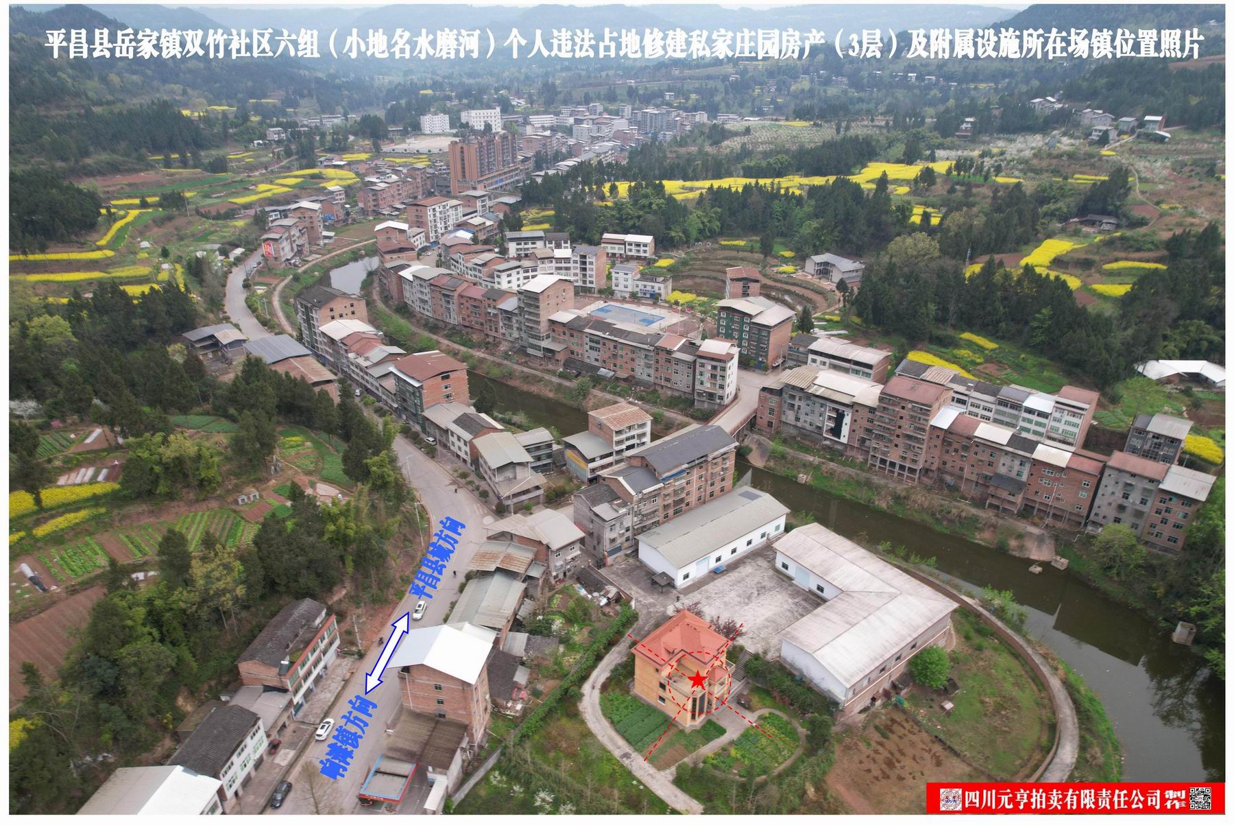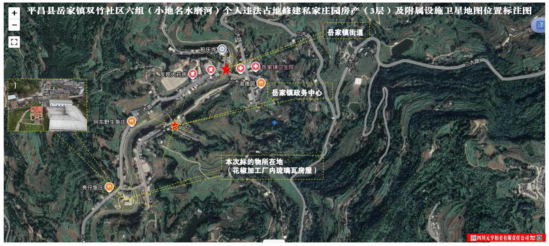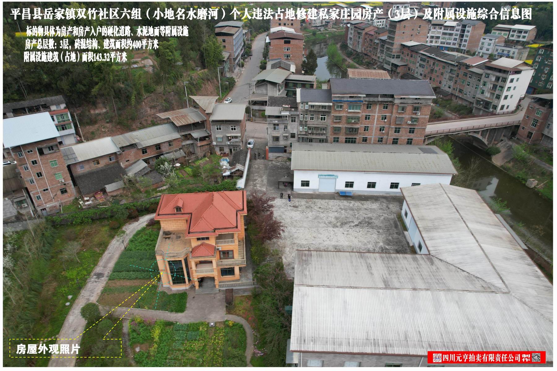 1、平昌县岳家镇双竹社区六组(小地名水磨河)个人违法占地修建私家庄园房产(3层)及附属设施(入户硬化道路及水泥地面),房产建筑面积约400平方米,附属设施建筑面积143.32平方米,整体拍卖,起拍价34.05万元。